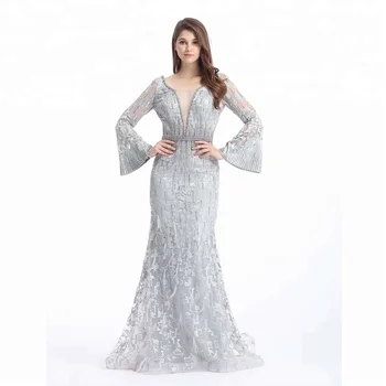 Silver Long Sleeve Mermaid Embroidered silver long gown