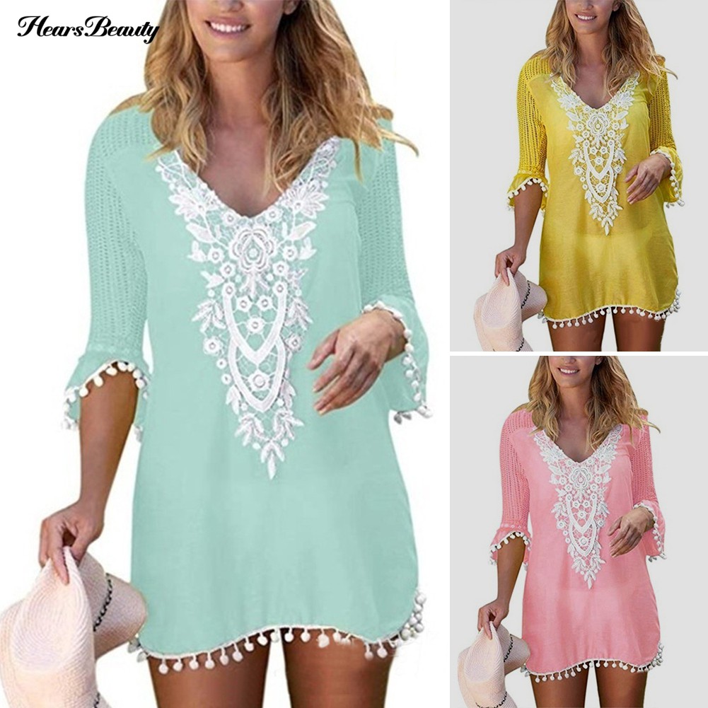 Pompom Trim Bikini Cover Up Dress plus size summer beach dresses