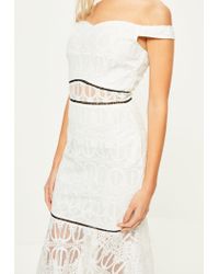 Laced In Love Scuba Bardot Pencil Dress white bardot lace frill hem midi dress