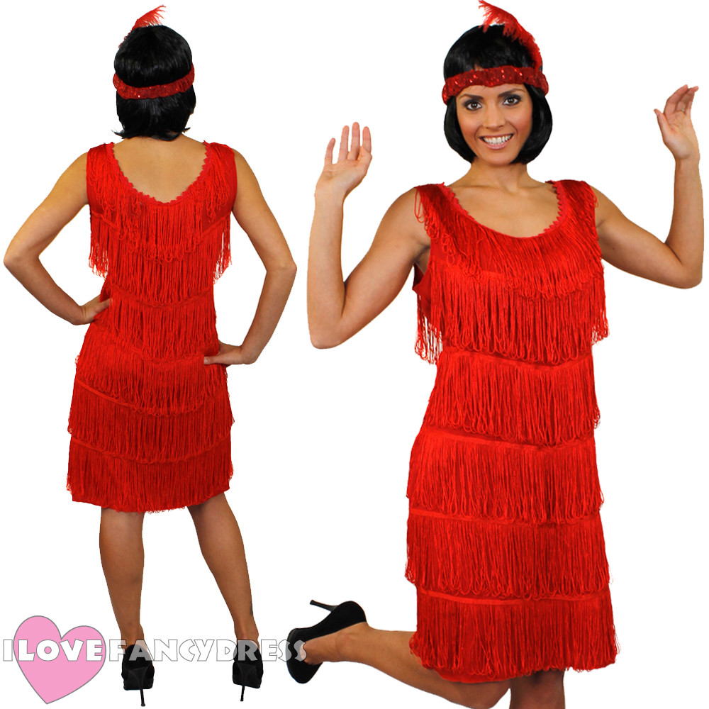 DELUXE RED FRINGE FLAPPER FANCY DRESS red fringe dress