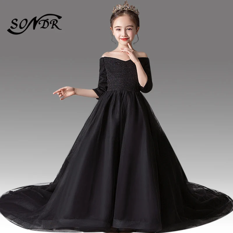 Long Black Girls Party Dress Ball Gown black tulle flower girl dress