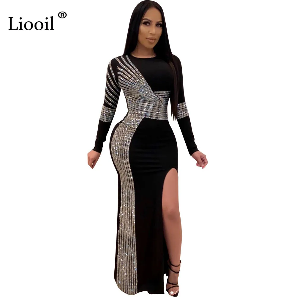 Liooil Black Rhinestone Sexy Slit long tight dress with slit