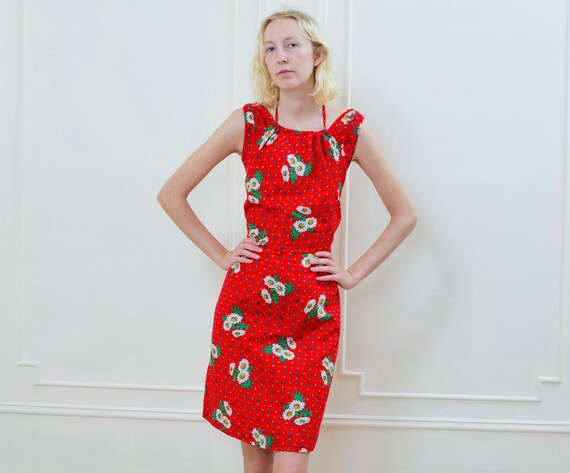 Red Floral Midi Dress Tied Belt Small red floral midi dress with sleeves