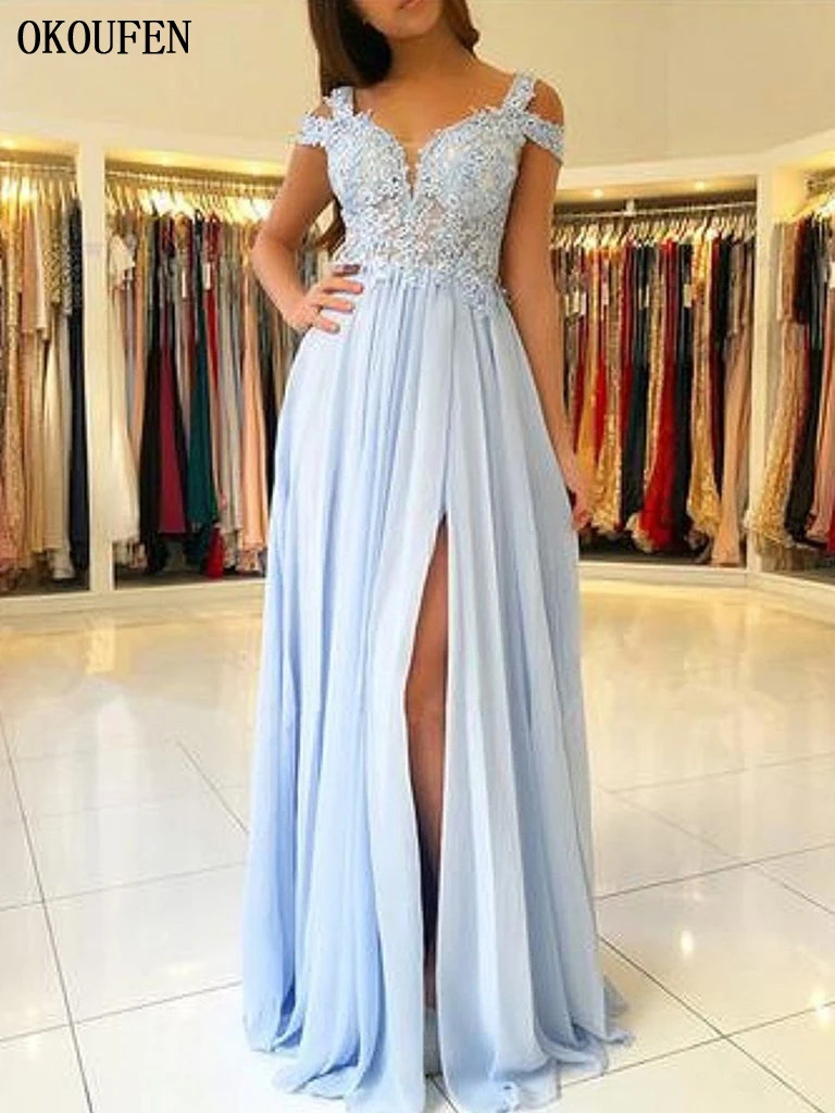 Shoulder Chiffon Formal Evening Gowns light blue homecoming dresses 2019