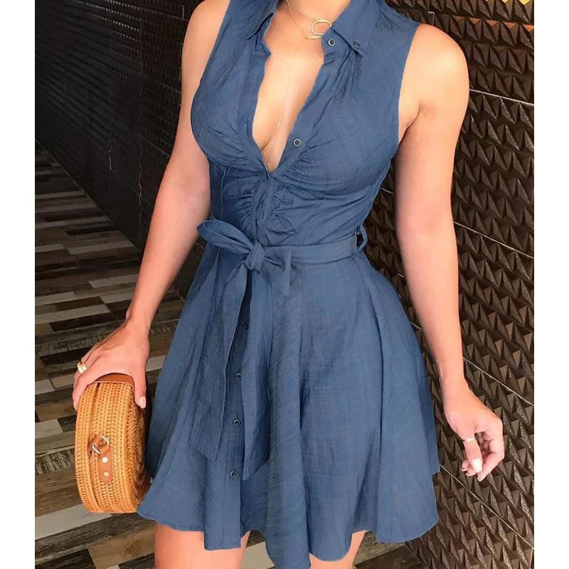 2019 New Summer Blue Mini Sundress Turn low cut sundress