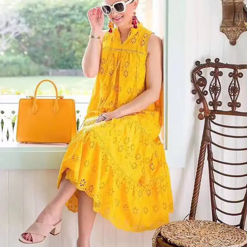 Lace Maxi Dress Women O neck Sleeveless yellow lace maxi dress