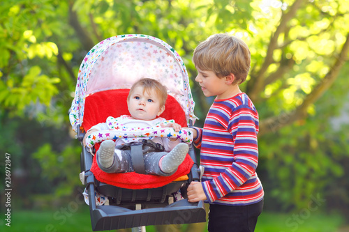 Little blond kid boy playing with baby pram for toddler to play with