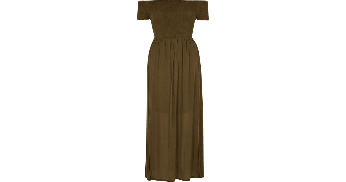 Khaki Green Shirred Bardot Maxi Dress shirred bardot maxi dress