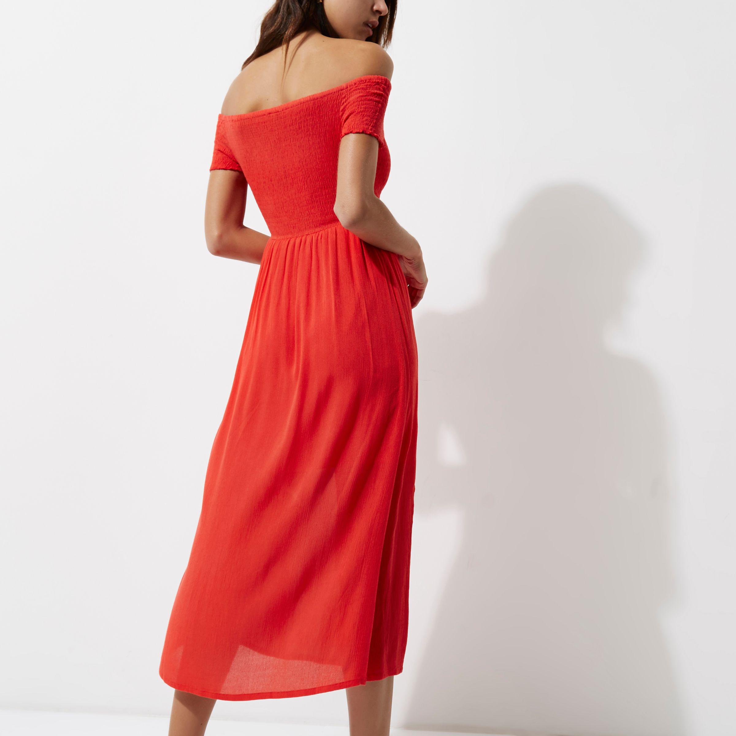 Red Shirred Bardot Maxi Dress - Lyst shirred bardot maxi dress