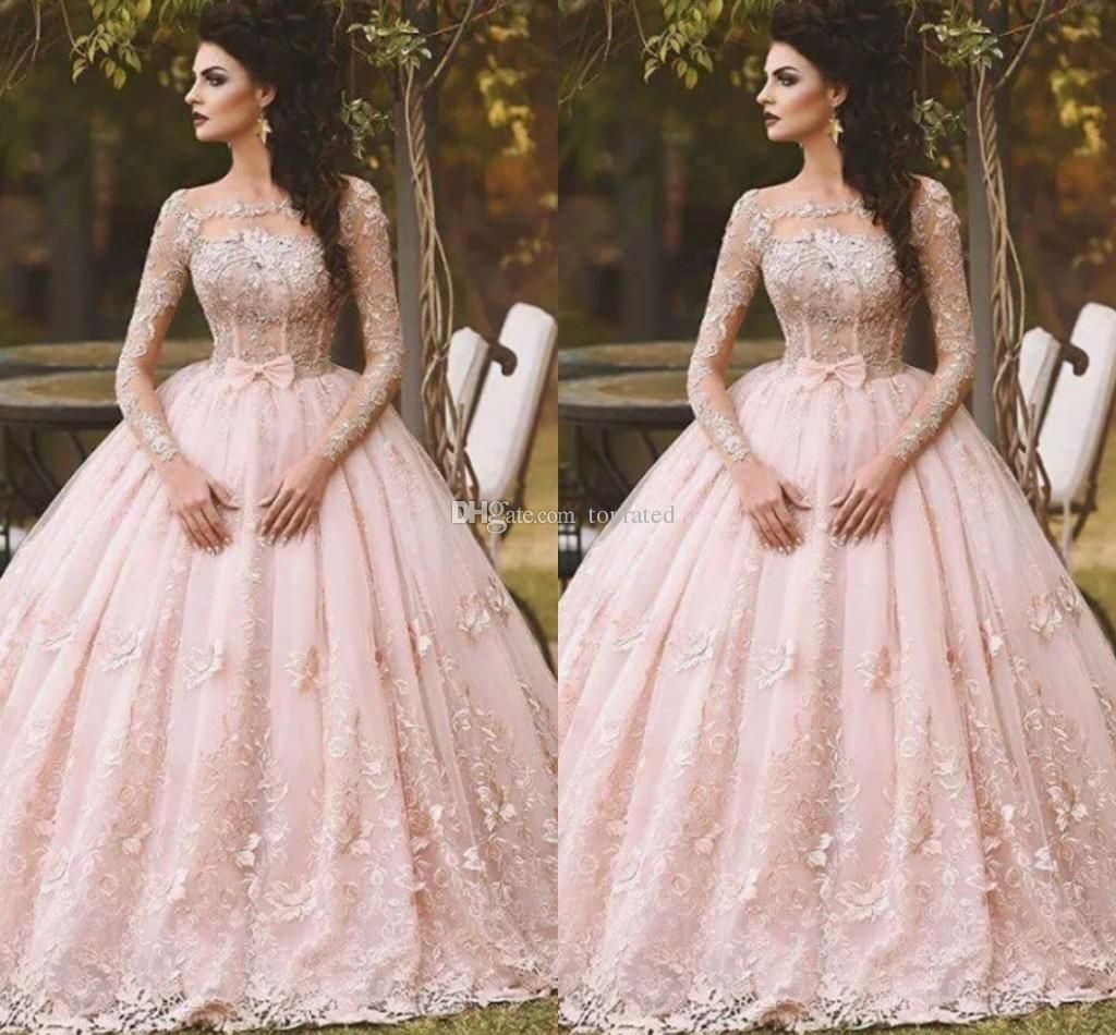 Pink Lace Ball Gown Debutantes long sleeve lace quinceanera dresses
