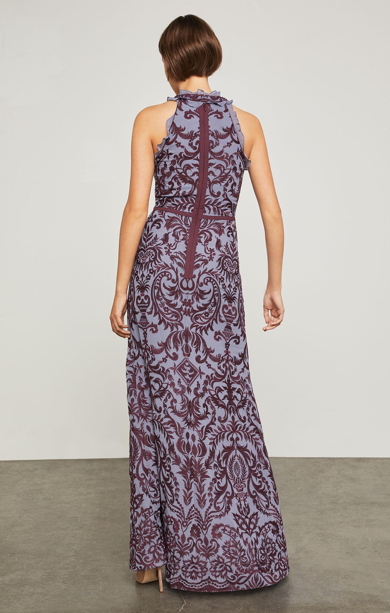 bcbg embroidered chiffon halter gown