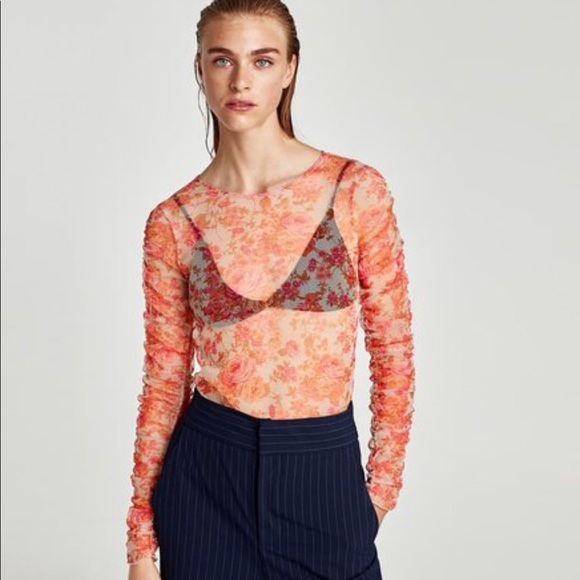 Zara Tops | Zara Sheer Mesh Long Sleeve orange mesh top long sleeve
